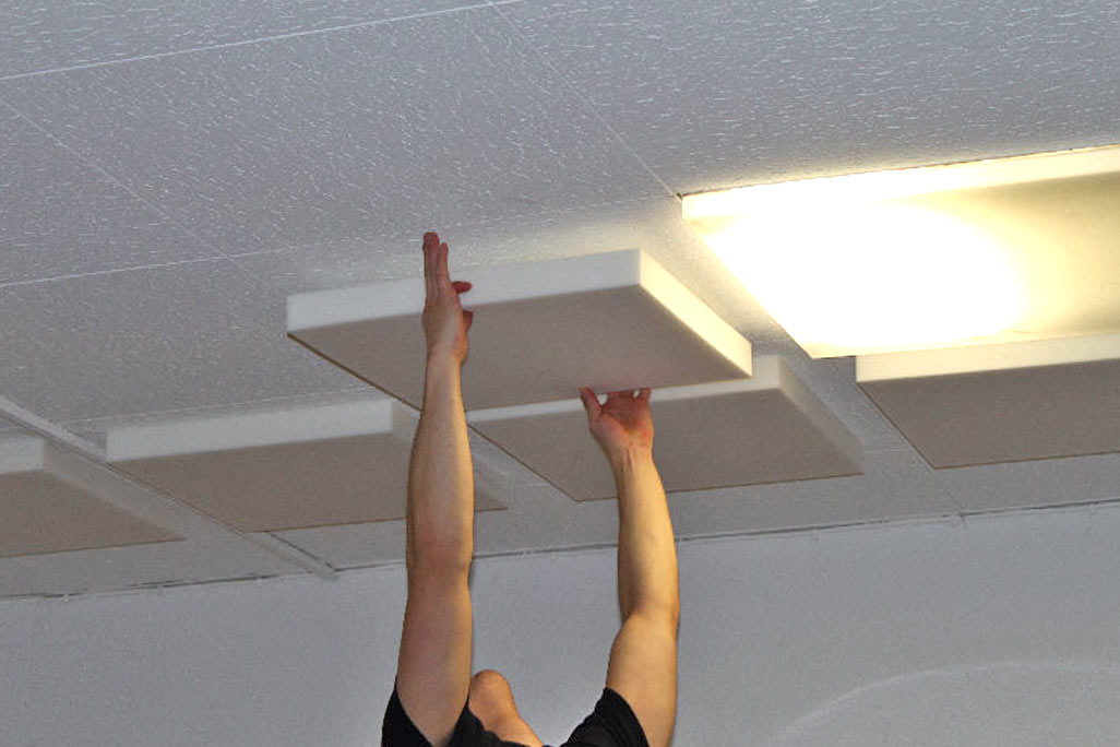 Zum Schallschutz und zur Reduzierung der Geräuschbelastung brachten wir die Akustikplatten soni PROTECT an der Decke an, die wir mit einer Schablone die gewünschten Formen zugeschnitten hatten.