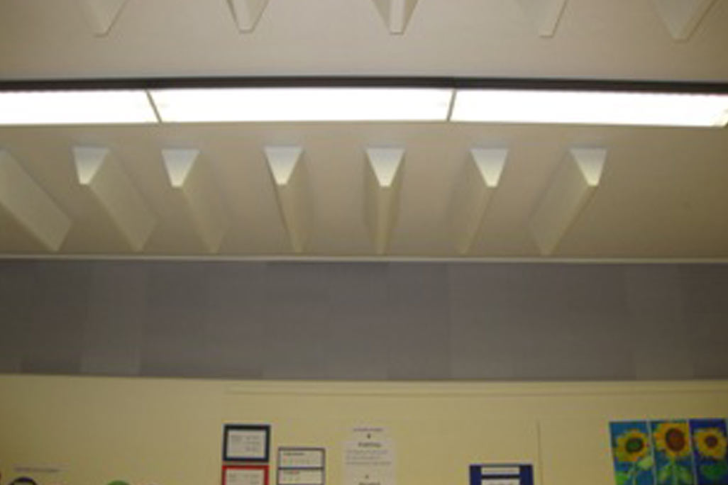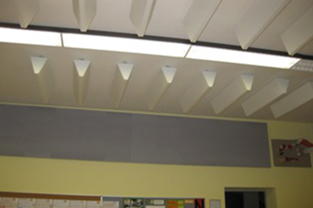 Die Anbringung der Schallschutzelemente soni TRAPEZ an der Decke einer Kita und des Klassenzimmers im Dachgeschoss sorgt für eine erhebliche Reduzierung des Schallpegels im Raum und fördert entspanntes und konzentriertes Lernen. Zusätzlich wird die Sprachverständlichkeit durch den Schallschutz deutlich erhöht, was ebenso auf die komplette Raumakustik zutrifft.