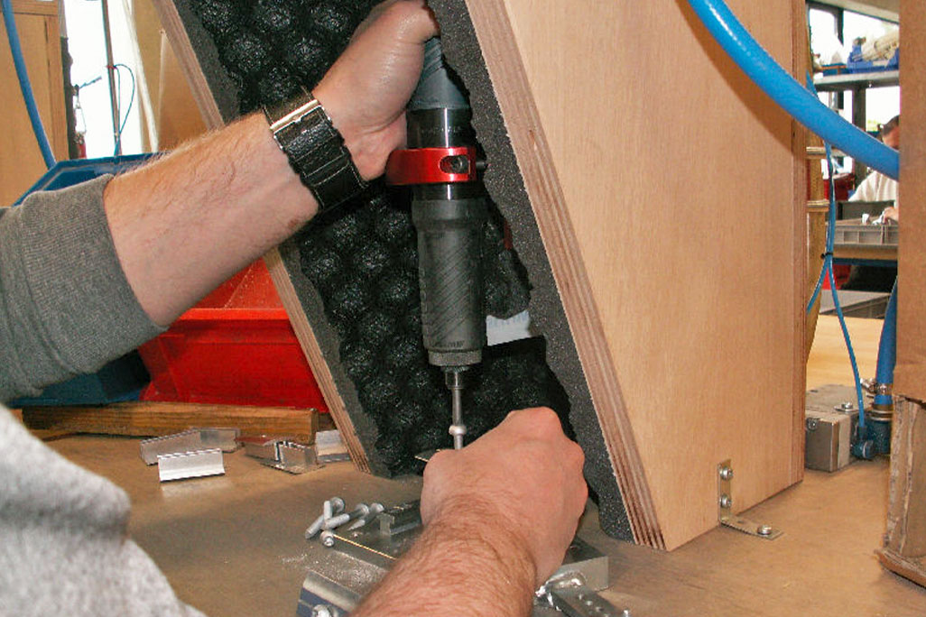 Den hohen Schallpegel unseres Druckluftkompressors senkten wir durch eine Einhausung aus massivem Holz, die innen mit dem hoch schallabsorbierenden Akustik-Noppenschaumstoff soni WAVE 50 mm ausgekleidet wurde.
